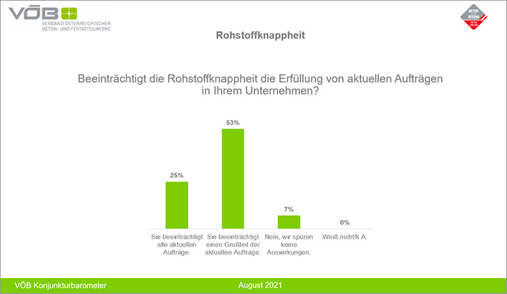 Eine weitere Wachstumsbremse für die Branche ist der aktuelle Rohstoffmangel. Jedes zweite Unternehmen meldet hier eine spürbare Beeinträchtigung bei einem Großteil der aktuellen Aufträge, die durch die Knappheit der Rohstoffe und die damit verbundenen Preissteigerungen entsteht. Fast jeder Betrieb (97 Prozent) rechnet hier mit Teuerungen entlang der ganzen Lieferkette, knapp 70 Prozent gehen gleichzeitig von einer Verlangsamung der Produktionszeiten als Folge des Rohstoffmangels aus.