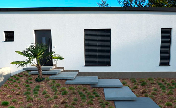 Die Winkelstufen der Freitreppe in modernem Anthrazit wurden ebenfalls vom BetonSTEINwerk Forchtenstein hergestellt. „Die Stufen wurden nach Maß erstellt. In die Stufen wurden dem Blindenleitsystem entsprechend tastbare Streifen integriert“, erklärt Trimmel.